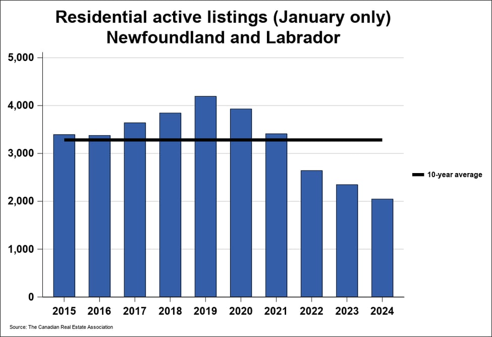 In Newfoundland there were 2,047 Active Listings for sale at the end of January; a decline of 13% from January 2023. Active listings have not been this low in more than 15 years.